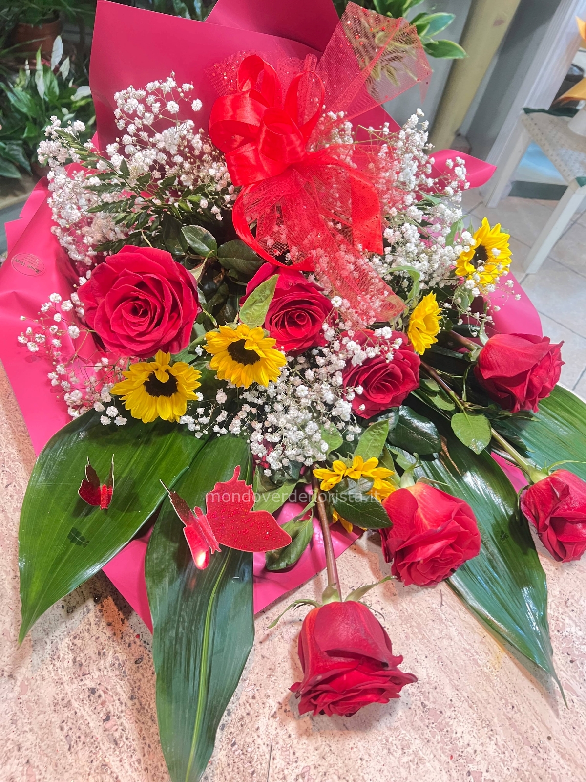 | Fascio di rose rosse e girasoli Cod. 121222 | € 50,00 | Quantità : | |